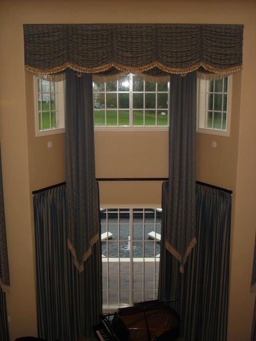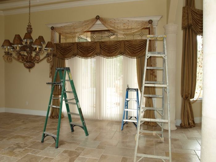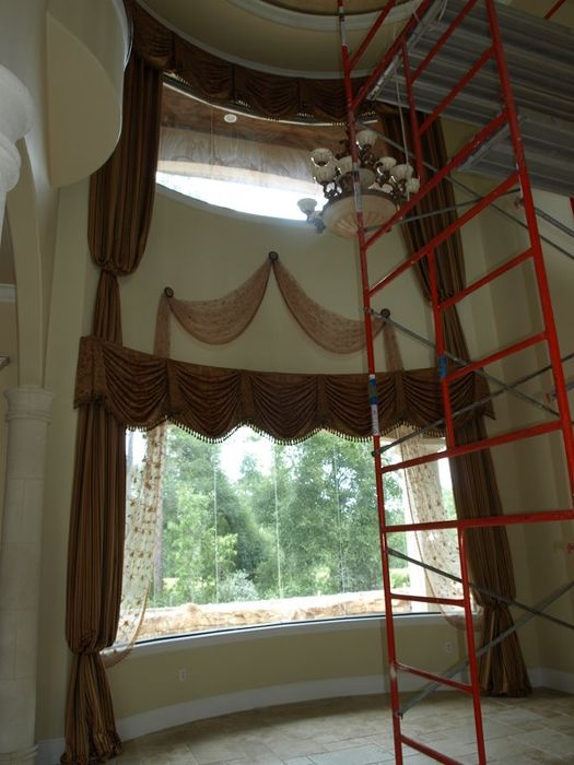 Suncraft Drapery has many years of experience installing draperies, decorative hardware, blinds, shades, valances, motorization, and other window treatments. Many of our installations are in standard rooms with 8’, 10’ and 12’ ceilings. We are equipped to handle tricky installations in bathrooms, on staircase landings, etc. We have our own scaffolding and ladders that go up 25 to 30 feet for some of the tall living rooms in many homes or in commercial settings.