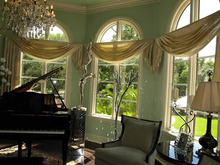 In our Top Treatment department we take pride and great care in the fabrication of all types and sizes of swag valances. We have the advantage of years of experience in swag construction and our expert consulting team will help you choose the correct lining or interlining that will enhance your fabric selection for proper drapability and beauty. From casual to dramatic or from pole swags to board mounted we have the expertise to turn your design into a true masterpiece. Whether it be an elaborate arch top swag valance or that hard to fit bay window, we will take your design and scale it to fit your window with your specifications.